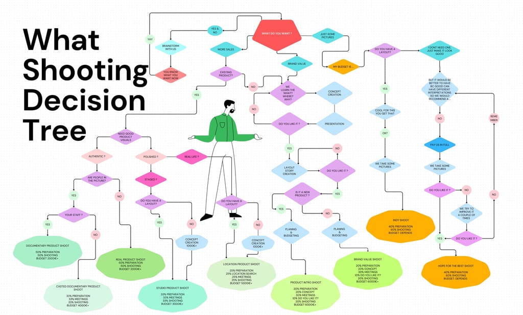 The flowchart shows nine possible outcomes, each with a breakdown of where the time and effort actually goes — concept, preparation, meetings, and the shoot itself. Spoiler: the shoot is rarely the biggest part.